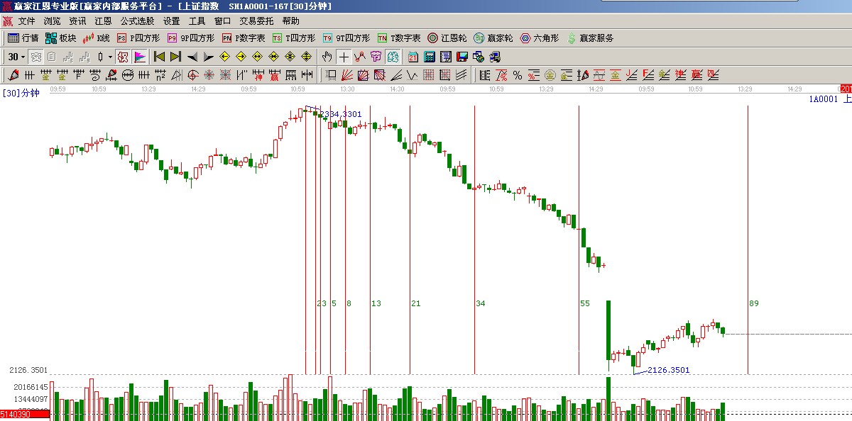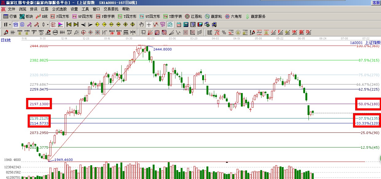 ★依據(jù)贏家江恩系統(tǒng)波段百分比提示:120度與135度(2114-2135)構(gòu)成指數(shù)當(dāng)前支撐帶,180度(2197)與缺口枃成阻力帶,市場有望在江恩波段百分比震蕩帶出現(xiàn)止跌,如圖(2);