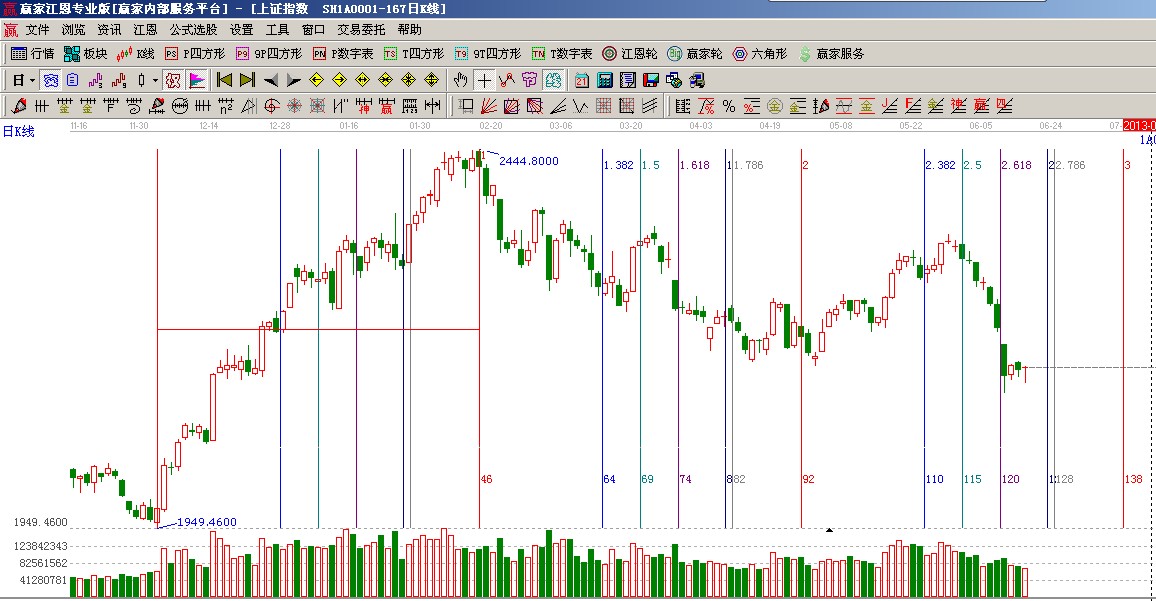 ★依據贏家江恩系統(tǒng)黃金時間周期線提示:從1949點至2444點做時間圖(3),分鐘圖時間窗18、19,日線時間窗21號;