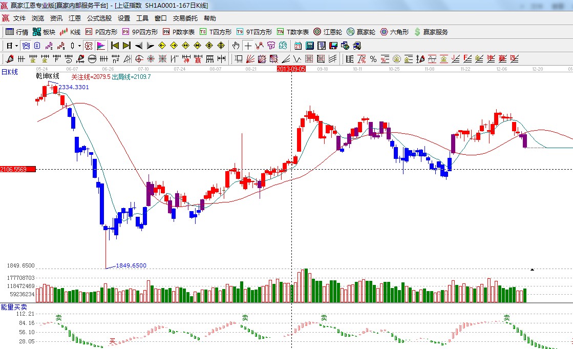 ☆依據(jù)贏家江恩系統(tǒng)乾坤K線提示: 出局線與關(guān)注線形成死叉,K線顏色將轉(zhuǎn)藍進入空頭 ;