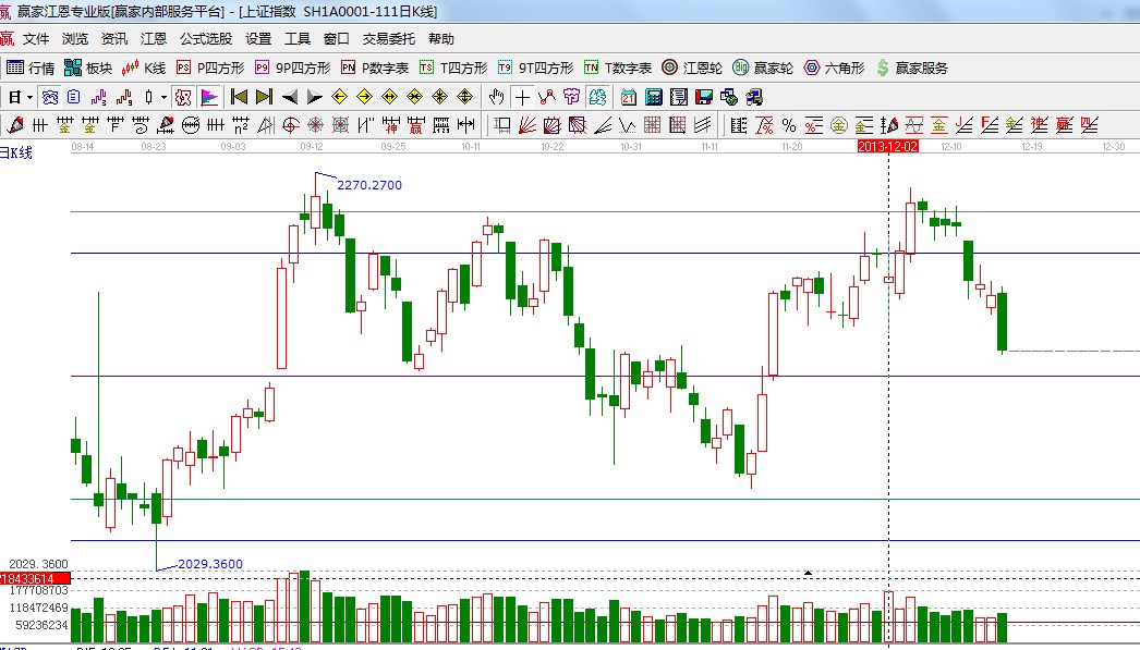 周末消息好壞參半,12月匯豐中國制造業(yè)PMI初值創(chuàng)3個月內(nèi)最低水平、新三板擴容對市場的負面影響較大,城鎮(zhèn)化消息面沒有超出預(yù)期,金融地產(chǎn)股的沖高回落,對大盤形成巨大的殺傷力,股指收出光腳陰線。技術(shù)面股指跌破極反通道生命線進入弱勢,觀察MACD如進入零軸下方則是日線級別的調(diào)整,短期來看大盤調(diào)整仍將持續(xù)調(diào)整;