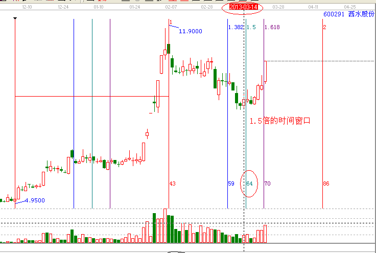 *:黃金時間周期線:依據(jù)贏家黃金時間周期線提示600291,3月14日低點(diǎn)為黃金時間周期的1.5倍的時間窗口,和江恩價格百分比的50%的位置形成四方,{使用方法:選擇一個完整的波段的高低點(diǎn),600291選擇低點(diǎn)12.4日低點(diǎn)——高點(diǎn)13年2月6日)【黃金時間延伸線是黃金分割理論和江恩等距離時間循環(huán)理論的完美結(jié)合。這個工具就是將一個完整的波段八分,這個工具主要是運(yùn)用黃金分割來預(yù)測指數(shù)和股價的變化時間的。起到一個變盤時間點(diǎn)的作用】