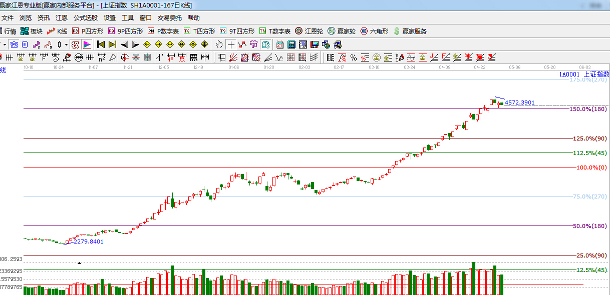 ★依據(jù)贏家江恩理論系統(tǒng)波段百分比提示:江恩百分比180度4300點附近支撐線,此位置不破整體趨勢不變,上方下一目標(biāo)位是270度,4700點附近。