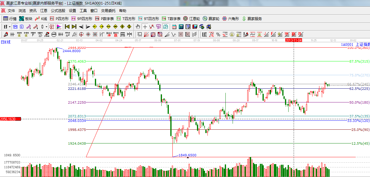 ☆依據(jù)贏家江恩系統(tǒng)波段百分比提示:日K線繼續(xù)在62.5%與66.67%區(qū)間震蕩,此區(qū)間以上則短線、波段持股,跌破則減倉;
