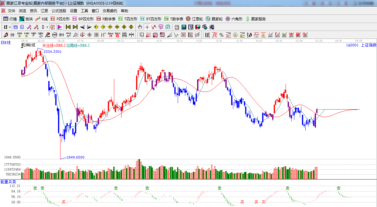 ★依據(jù)贏家江恩系統(tǒng)乾坤K線提示:底部由藍(lán)色變?yōu)樽仙?,警示信?hào),放量突破關(guān)注線,謹(jǐn)慎看多。