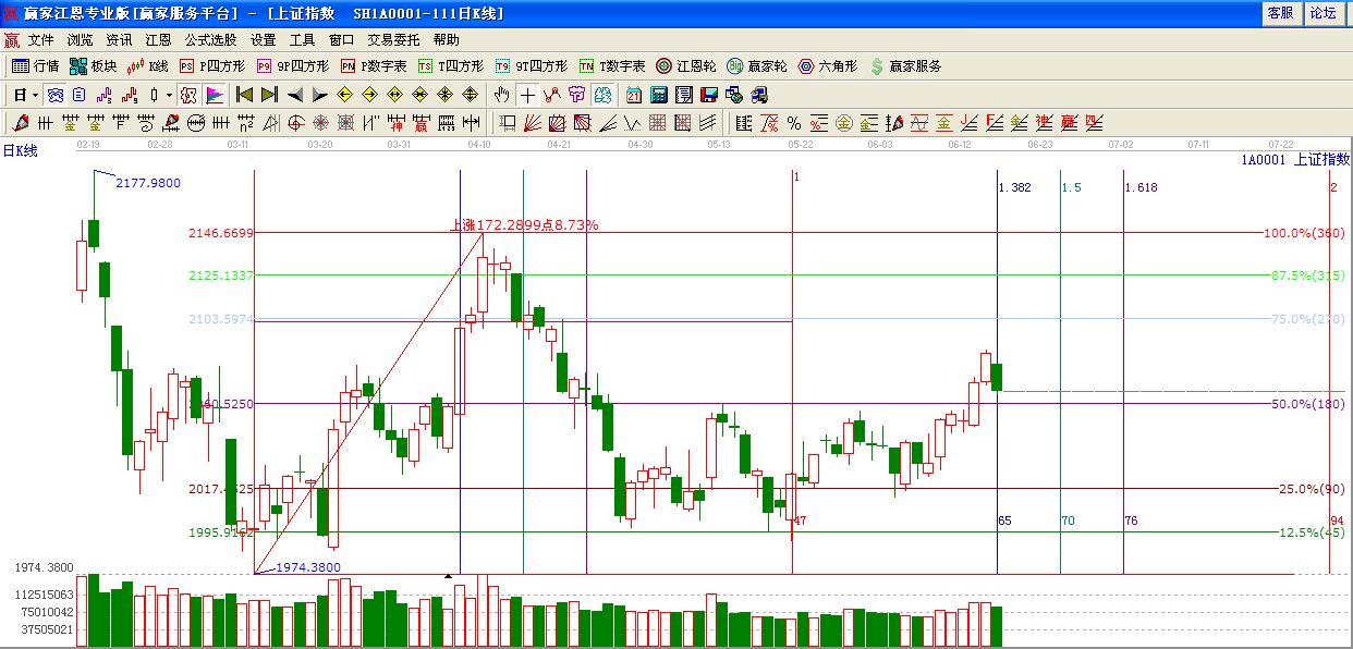☆依據(jù)贏家江恩系統(tǒng)黃金時間周期線提示:近期是16. 17日時間窗口,2060位置不破短期有望沖擊2100點。